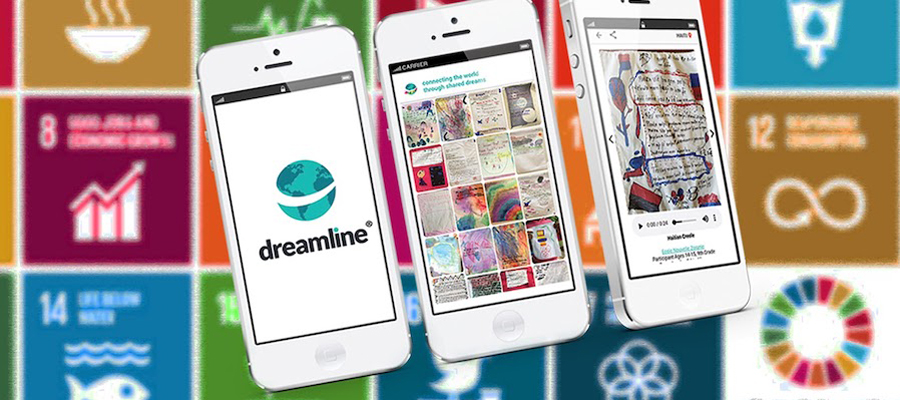 Each participant reflects on values, visions for change, and steps to get there, then creates a Dream Banner expressing their dream to share with the world. The Dreamline World Mobile App collects and connects with hashtags for UN SDGs. Social-Emotional Learning is integrated throughout.